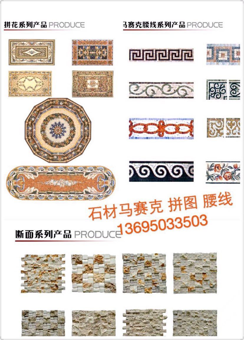 石材加工 水刀拼花 石材馬賽克 拼圖 拼花腰線 復(fù)合板等系列 歡迎來(lái)電詢價(jià) ??13695033503