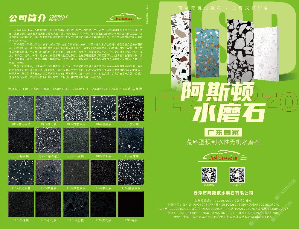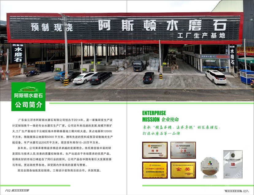 廣東省云浮市阿斯頓水磨石有限公司創(chuàng)辦于2014年,是一家集研發(fā)生產(chǎn)設計定制銷售于一體的專業(yè)水磨石生產(chǎn)廠家,公司近年來迅速的發(fā)展,規(guī)模不斷擴大,工廠生產(chǎn)基地位于云城區(qū)格木橋轉(zhuǎn)移基地三期興旺大道,其占地面積12000平方米,旗艦展館占地面積5000 平方米,擁有先進的荒料成型及切割拋光生產(chǎn)線設備,年產(chǎn)水磨石達200萬平方米,現(xiàn)貨常年庫存15-20萬平方米。 \\\