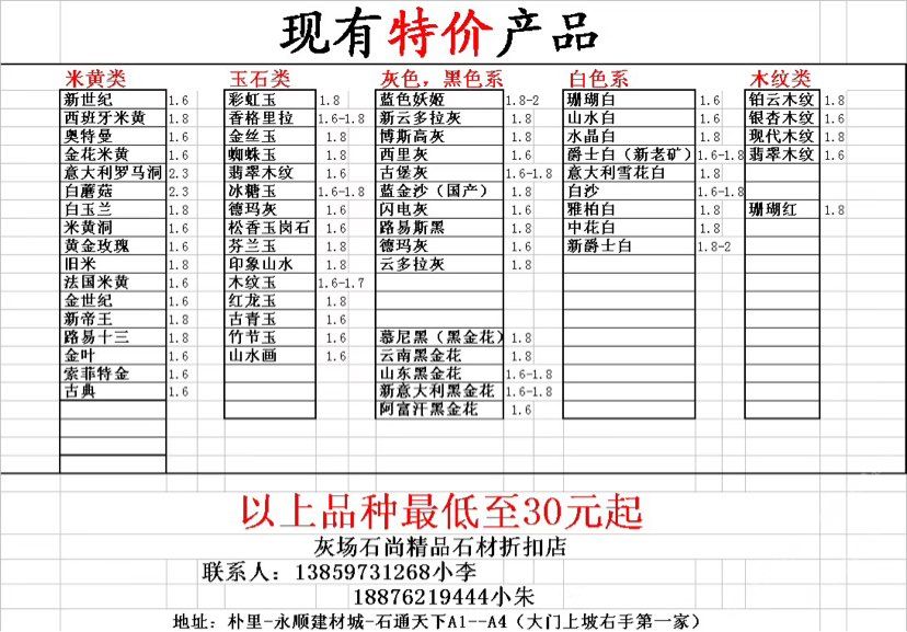 主營(yíng)四大系列:玉石列、灰色列、米黃列、黑色列。以上產(chǎn)品全部一折起……石材及五金配件對(duì)接售后服務(wù)。