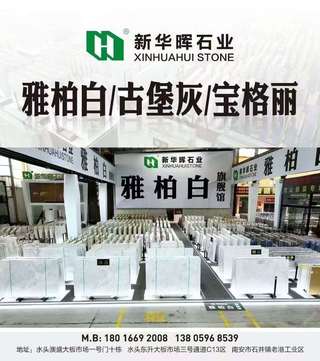 福建南安【賣場地址】水頭鎮(zhèn)澳盛大板市場2號門直走8棟新華暉白石空間
