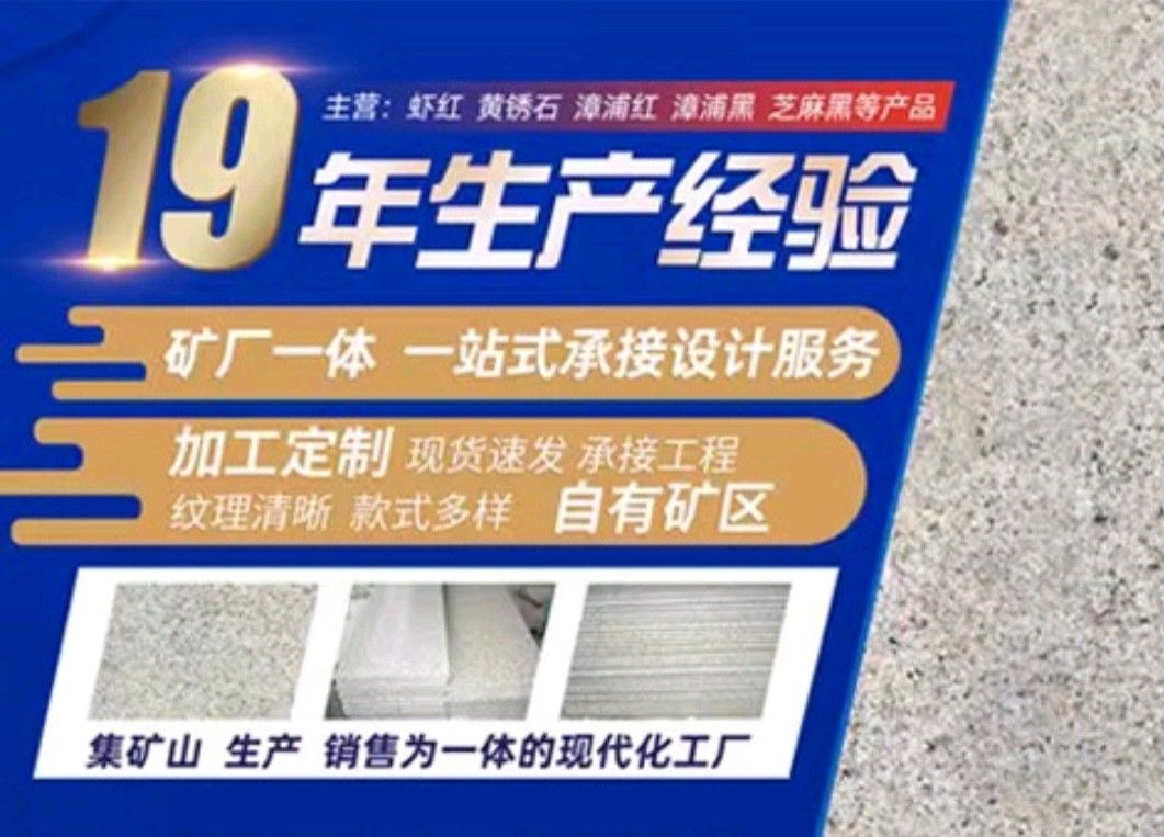 漳浦縣鴻勝石材有限公司是一家集礦山開采、自營加工生產、自主產供銷為一體的石業(yè)公司,公司擁有數家生產基地、手工加工場、大型礦山。公司創(chuàng)業(yè)歷程10年,憑著豐富的加工生產經驗、雄厚的技術力量和先進的設備,產品遠銷歐美、韓國、新加坡、臺灣等地,深受客戶的信賴與好評。 本公司產品主要有: 漳浦紅,漳浦黑,漳浦青,漳浦蝦紅,漳浦銹石,福建青,安山巖,芝麻黑,芝麻灰,沙漠棕等。