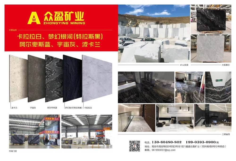 眾盈 聯(lián)系人:高少    150****0802 查看 199****0900 查看 主營(yíng)范圍: 大板批發(fā)、荒料、礦山、 企業(yè)地址:福建泉州高時(shí)國(guó)際石材交易中心9號(hào)館1號(hào)門1通道3號(hào)倉(cāng)1區(qū)眾盈礦業(yè)