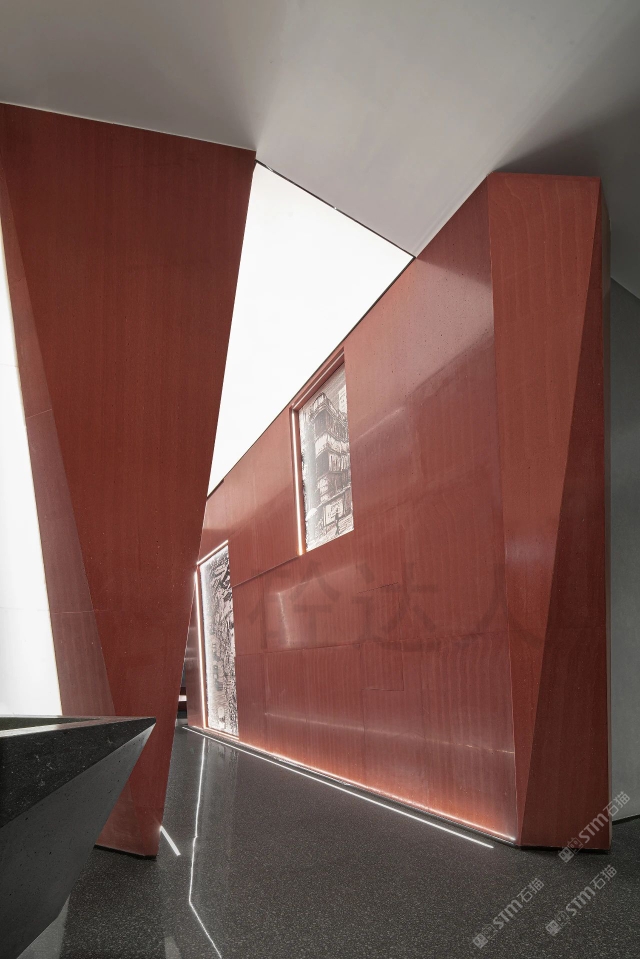 發(fā)布信息: 紅色淺紋洞石運(yùn)用室內(nèi)墻面,異型拼接無縫處理