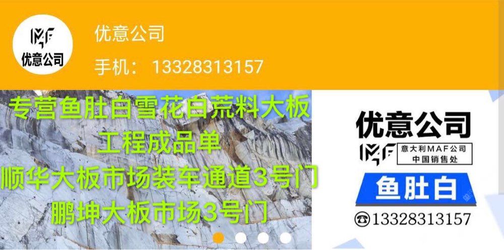 發(fā)布信息: 優(yōu)意公司是意大利MAF公司中國銷售處,03年開始在中國銷售魚肚白、雪花白、大花白、卡拉拉白、卡金,卡拉卡塔,魚肚金荒料、大板、薄板,復(fù)合板,工程板、線條,馬賽克,異型加工、工藝品,承接工程成品單。合作電話,郭??13950008780;張?? 18950052806