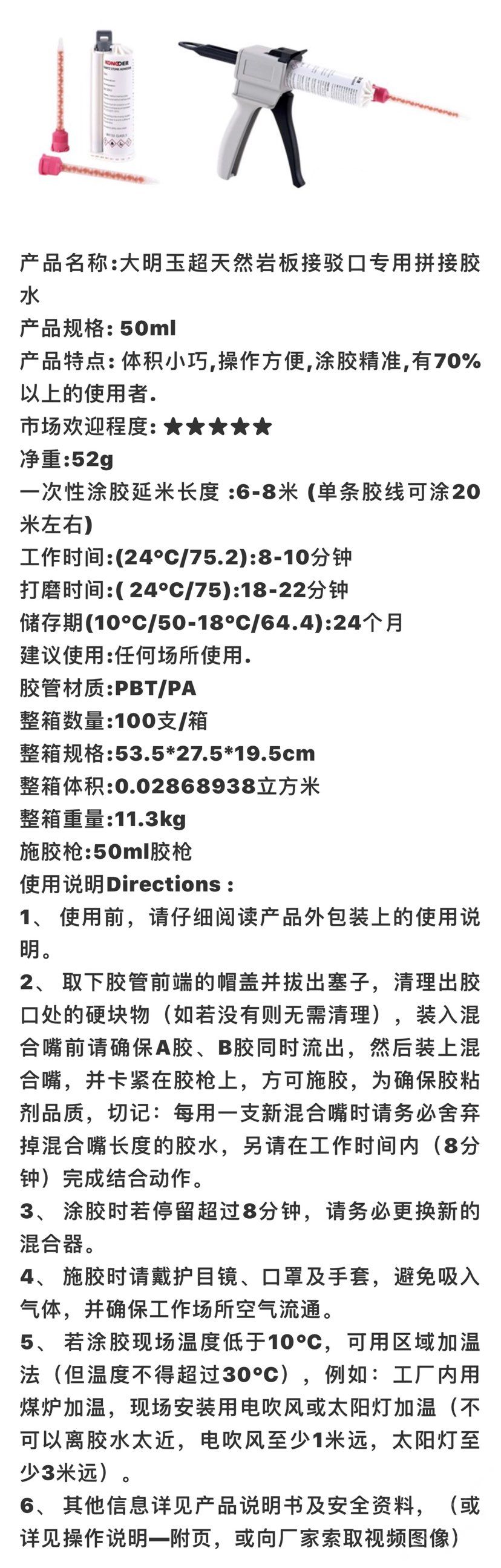 發(fā)布信息: SIBELAN斯貝納巖板專(zhuān)用接縫膠水 國(guó)內(nèi)大廠18年專(zhuān)業(yè)生產(chǎn)巖板膠水廠家, 產(chǎn)品描述ProductsDescription 配套有專(zhuān)業(yè)膠槍。 50ml 石英石/巖板/亞克力 無(wú)縫拼接膠水 涂膠延米:4米。 250mlPE 石英石/巖板/亞克力 無(wú)縫拼接膠水 涂膠延米: 30左右米 250mlPBT石英石/巖板/亞克力 無(wú)縫拼接膠水 涂膠延米: 30左右米(實(shí)際280ml左右) 適用材質(zhì):石英石板材、巖板、天然大理石、 崗石、純亞克力板材、復(fù)合亞克力板材、 不飽和聚酯板材,。 適用顏色:差異化調(diào)色。 膠管材質(zhì):PBT。 產(chǎn)品優(yōu)點(diǎn):高效、省時(shí)、 專(zhuān)業(yè)、穩(wěn)定、環(huán)保。