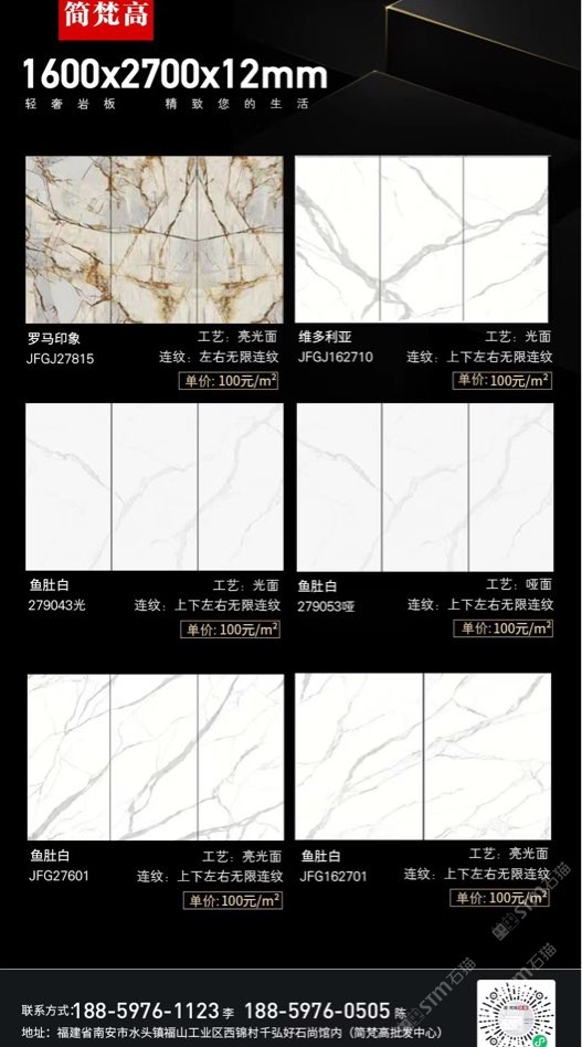 簡(jiǎn)梵高巖板(批發(fā)) 聯(lián)系人:陳先生    188****0505 查看 手機(jī)號(hào)碼:無(wú) 主營(yíng)范圍: 大板批發(fā)、環(huán)境石材、人造石加工、 企業(yè)地址:福建南安水頭鎮(zhèn)福山工業(yè)西錦村千弘好石尚館內(nèi)(批發(fā)中心)