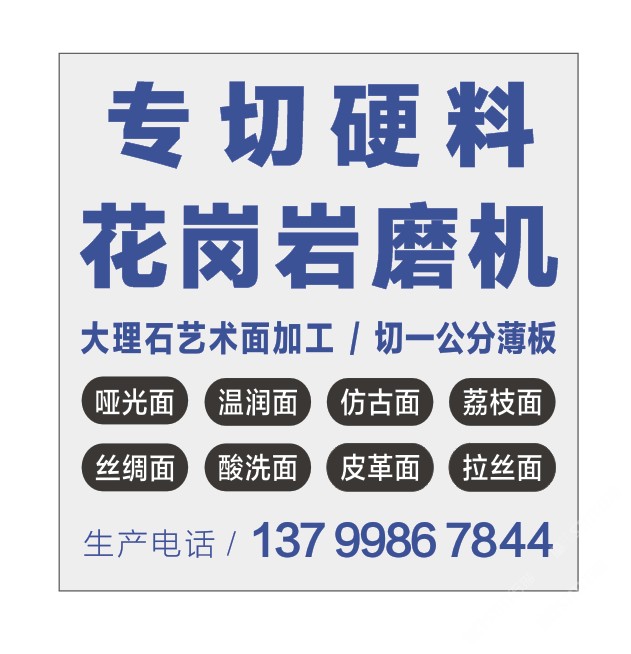 發(fā)布信息: 專切硬料 一公分薄板 花崗巖磨機 三臺靜壓拉鋸 一臺靖佑大理石磨機 一臺靖佑花崗巖磨機 意大利進口磨頭 來料加工 大理石藝術面 荔枝面 皮革面 溫潤面 仿古面 地址在埭頭村 聯豐工業(yè)區(qū) 8 號 興業(yè)石材廠 鴻群生產加工中心 馮廠長 13799562486
