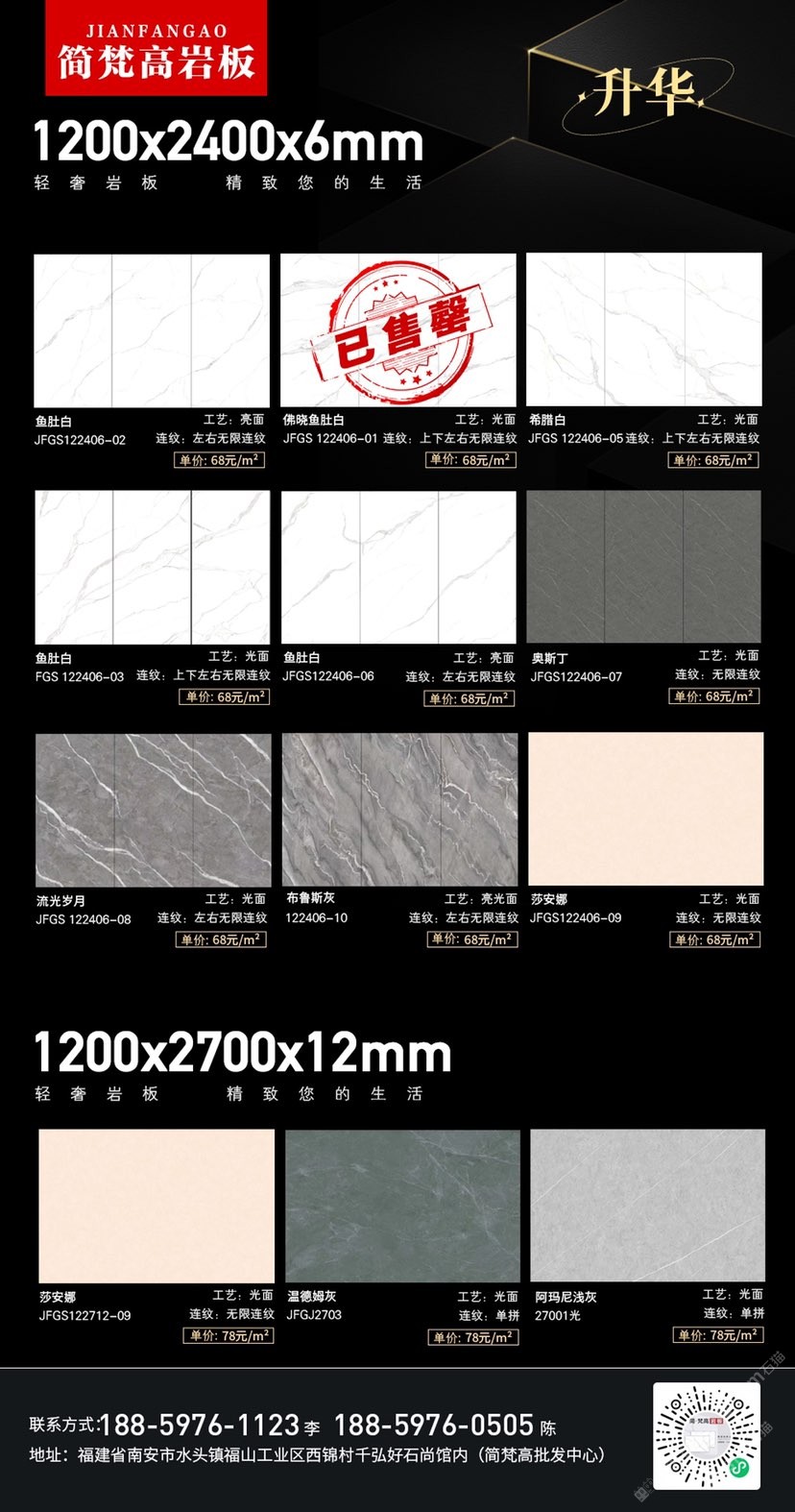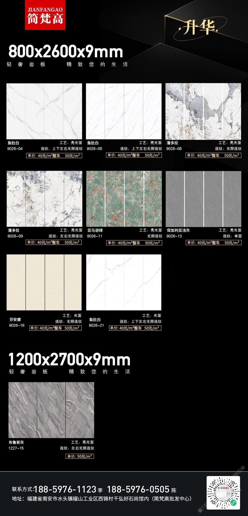 簡(jiǎn)梵高巖板(批發(fā)) 聯(lián)系人:陳先生    188****0505 查看 手機(jī)號(hào)碼:無(wú) 主營(yíng)范圍: 大板批發(fā)、環(huán)境石材、人造石加工、 企業(yè)地址:福建南安水頭鎮(zhèn)福山工業(yè)西錦村千弘好石尚館內(nèi)(批發(fā)中心)