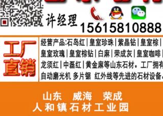 榮成市人和先業(yè)石材廠主營產(chǎn)品:石島紅,皇室珍珠,石島紅(7號(hào)),紫晶鉆,紫晶鉆1,紫晶鉆2,紫晶鉆小花,紫晶鉆大花,皇室珍珠1,中國棕,中國棕1,皇室啡4,皇室棕,皇室瑪瑙,皇室啡珠2,皇室啡珠1,皇室啡珠,皇室啡珠大花,皇室棕鉆,龍須紅G3787,乳山灰,皇室啡,石島紅(新8號(hào)),白麻企業(yè)地址:山東威海榮成市人和鎮(zhèn)寨前村